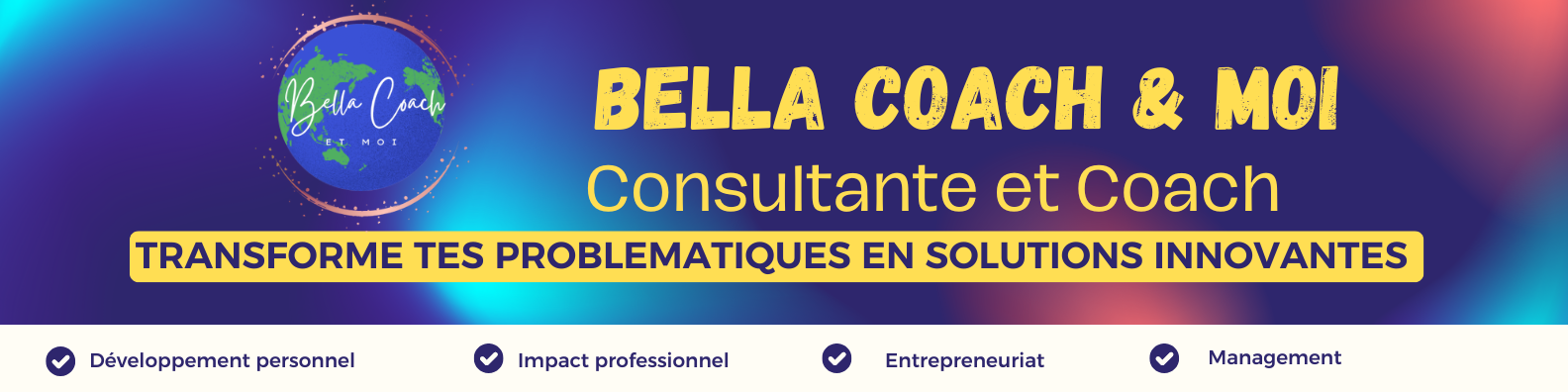 Bienvenue chez Bella Coach et Moi, votre partenaire pour réussir dans vos projets professionnels et personnels ! Nous sommes une équipe de coachs expérimentés, engagés à vous accompagner dans la réalisation de vos objectifs et à vous aider à atteindre vos performances maximales. Notre mission principale est de vous coacher, de vous accompagner et de vous performer dans votre vie professionnelle et personnelle.
