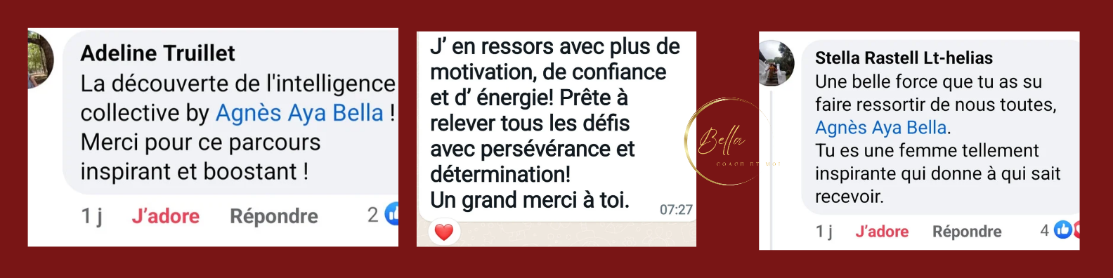 2025. L'année où tout a basculé dans ma vie. Au fond du gouffre, j'ai besoin d'aide pour remonter à la surface. Fin Février 2026, j'appelle Bella. Je trouve une écoute bienveillante, des questionnements pertinents, des révélations percutantes. Un plan d'action évident. Mi Mars 2026, j'en suis à ma dernière séance -Déjà ?- je regarde en arrière et je ne me reconnais plus. Merci Bella, je vais te recommander à toutes celles qui auront besoin de remonter la pente qui croiseront mon chemin. Ce beau chemin que tu m'as aidée à tracer. Magali S. Saint-Paul, 974